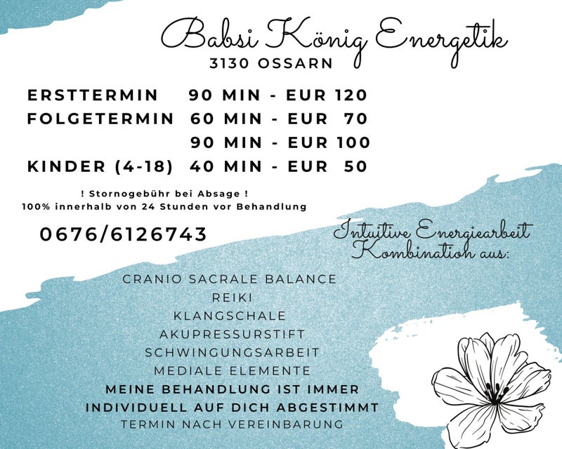 Die Erstbehandlung dauert 90 Minuten (+ kurzes Vorgespräch) und kostet EUR 120,-